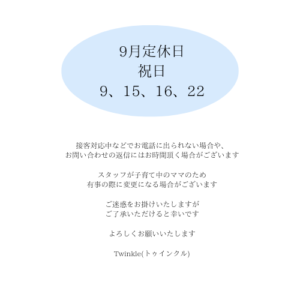 お問い合わせのご返信には少しお時間いただく場合がございます。毎月不定休のお休みですがどうぞ宜しくお願いいたします。Twinkle